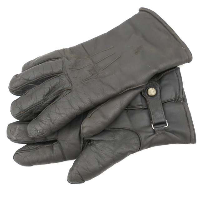 Luftwaffe Leather Flying Gloves (Handschuhe für Fliegendes Personal). Luftwaffe pilots and aircrew personnel utilized a wide variety of gloves. These gloves are made of high quality darkgrey coloured leather. The brown leather gloves are not visible marked or dated, the press-studs are 'Nappa' marked. The gloves are lined with rabbit fur. The gloves are in clearly used condition as found. Scarce original pair of Luftwaffe flying gloves in good used condition.