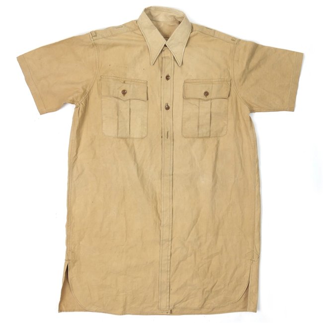 Luftwaffe Tropical Shirt (Tropenhemd). The tan cotton construction shirt, featuring two breast pockets with buttoned flaps, was the standard Luftwaffe tropical shirt. The breast eagle has been removed. One button is missing. Otherwise in good slightly used and worn condition. Nice original Luftwaffe Tropical Shirt, perfect to complete your mannequin with.