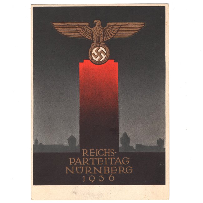 This is a nice original colourful postcard of the 'Reichsparteitag der NSDAP - Nürnberg s. - 14 September 1936'. The card was designed by 'Professor Richard Klein' and shows an artistic image with a gold eagle with swastika in very vibrant colours (the gold is shiny, however hardly visible on the scans). This postcard was published by 'Zentralverlag der NSDAP' from München. The card is in unissued condition and measures approximately 15 x 10,5 cm. in size. Very nice and decorative original postcard.