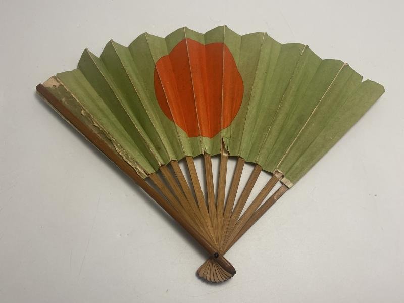 Original Imperial Japanese fan. Rising sun one side, emperors motto the other side. Hand painted paper on bamboo sticks. The fan folds and opens as it should. A nice period piece.