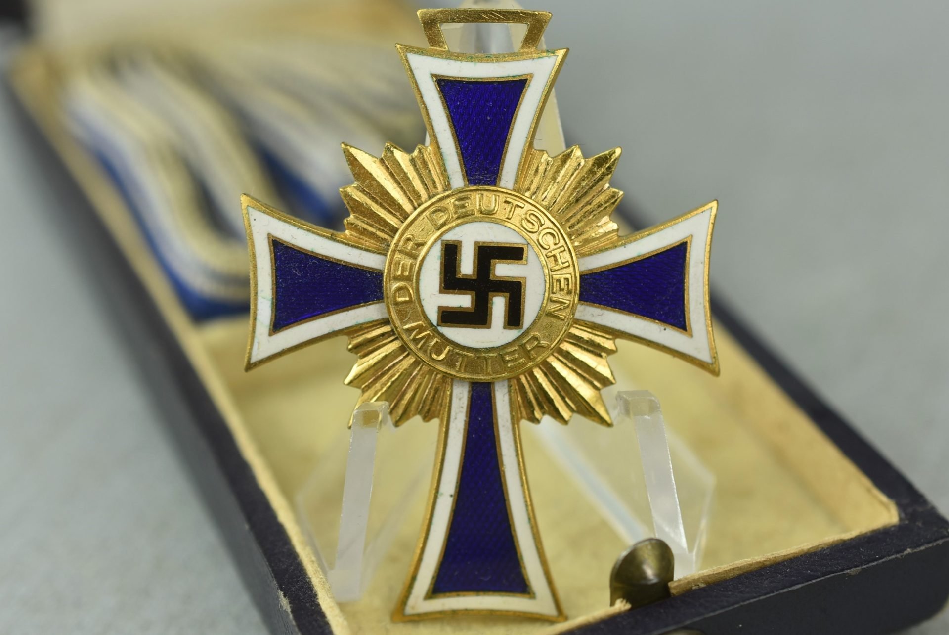 Gold mother's cross, in very good condition. Full length ribbon and box with manufacturer stamp of C.F. Zimmermann, Pforzheim.