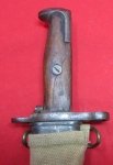 Original period manufacture. US M1905 bayonet, the classic service bayonet of the AEF 1917-1918. Cleaned steel & patina finish to the SA (Springfield) 1918 marked blade, serial number 893128. Even steel patina finish remains in the fullers and remainder of the blade. Intelligent sharpening to the blade edge. Darker steel patina finish to the guard and pommel, with a pair of smooth finish walnut grips. The lock button works as it should. Nice quality replica Army style canvas covered scabbard.