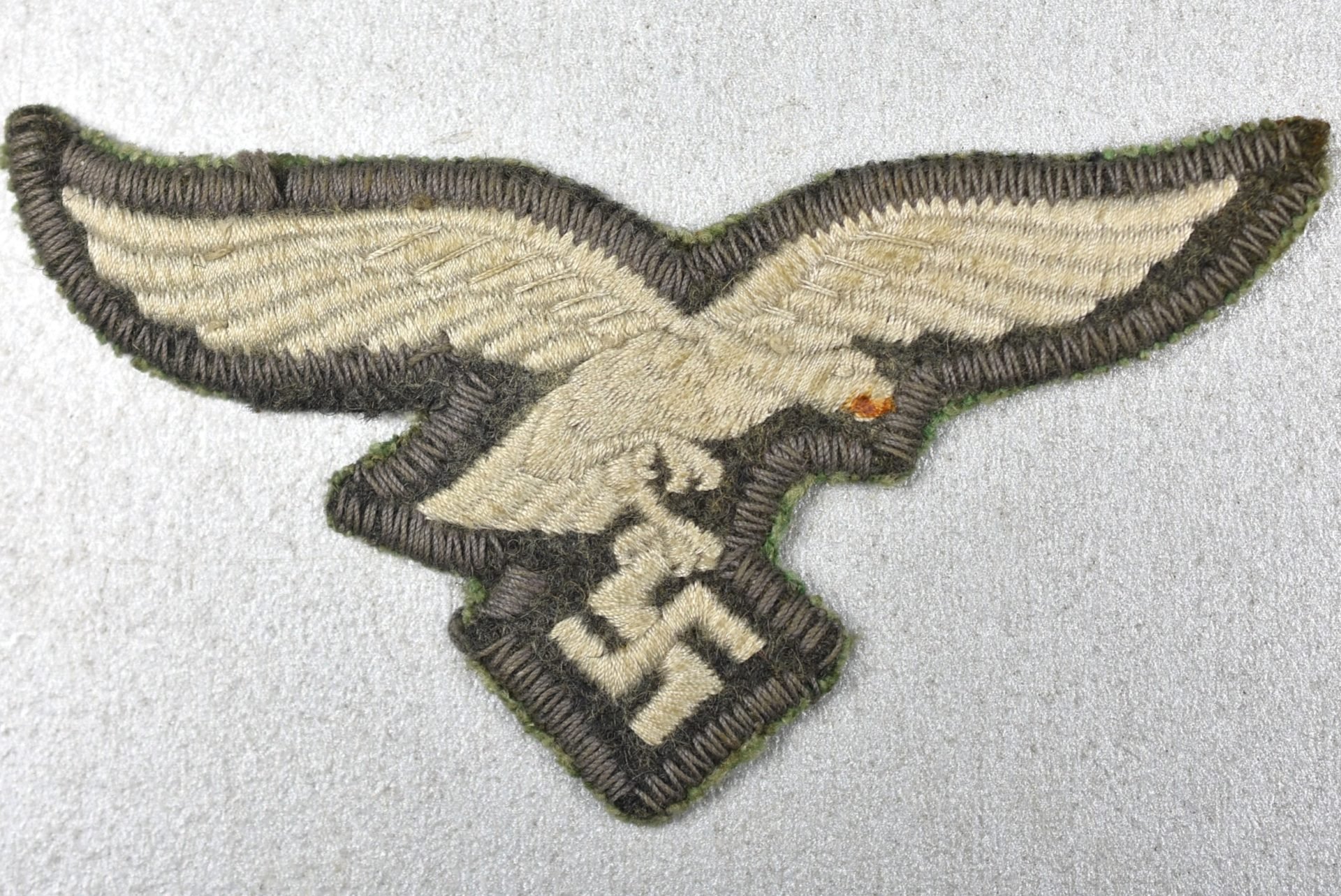 Worn standard Luftwaffe breast eagle. Machine embroidered eagle in white thread on blue felt. Machine applied cut-off example, with a part of the green splittertarn cloth of a field division still present.