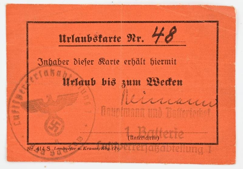 In a very good condition a German Luftwaffe Holiday Leave card (Urlaubkarte). The oilpaper card comes with the unit stamp of the Luftwaffe unit.
