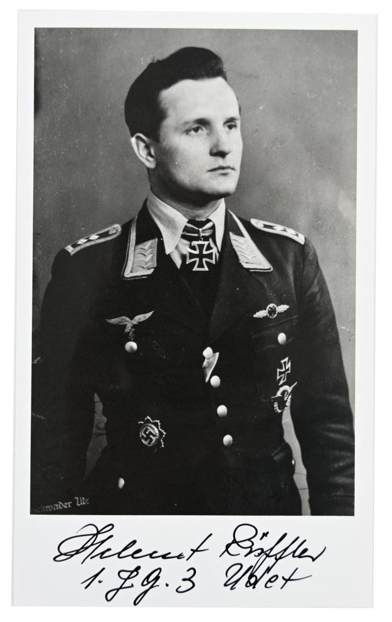 In a very good condition a postwar portrait picture with original signature of Helmut Rüffler. Oberleutnant Helmut Rüffler earned the German Cross in Gold on December 3, 1942 and the Knight's Cross of the Iron Cross on December 23, 1942 as Oberfeldwebel und Flugzeugführer in the 4. Staffel/ Jagdgeschwader 3 “Udet”.