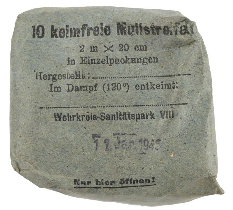 In a very good condition a German First Aid Bandage (10 Keimfreie Mullstreifen). The package is issued by Wehrkreis-Sanitatspark VIII and dated 11 January 1945.