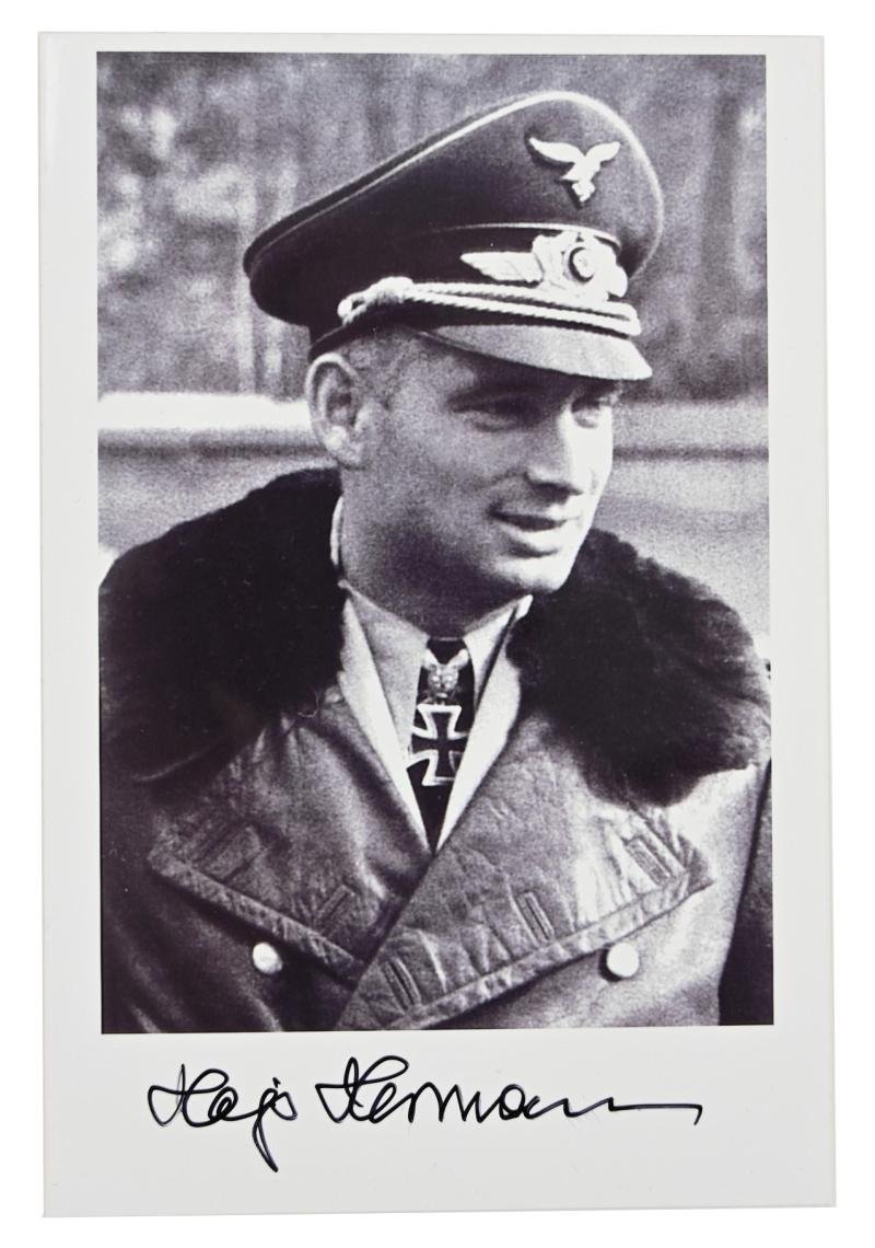 In a very good condition a postwar large size card with original signature of Hans-Joachim “Hajo” Herrmann was a German World War II Luftwaffe pilot and officer who was awarded the Knight's Cross of the Iron Cross with Oak Leaves and Swords. Hermann joined the newly formed Luftwaffe in 1935 and served during the Spanish Civil War. During World War II while serving as a bomber pilot he was credited with sinking 70,000 tons of Allied shipping. In 1942 he served on the general staff of Hermann Goring and played a key role in the creation of the night fighter wing and also achieved 9 victories in a night fighter. In 1944, he was appointed as the Luftwaffe Inspector of Aerial Defense and Inspector General of night fighters.