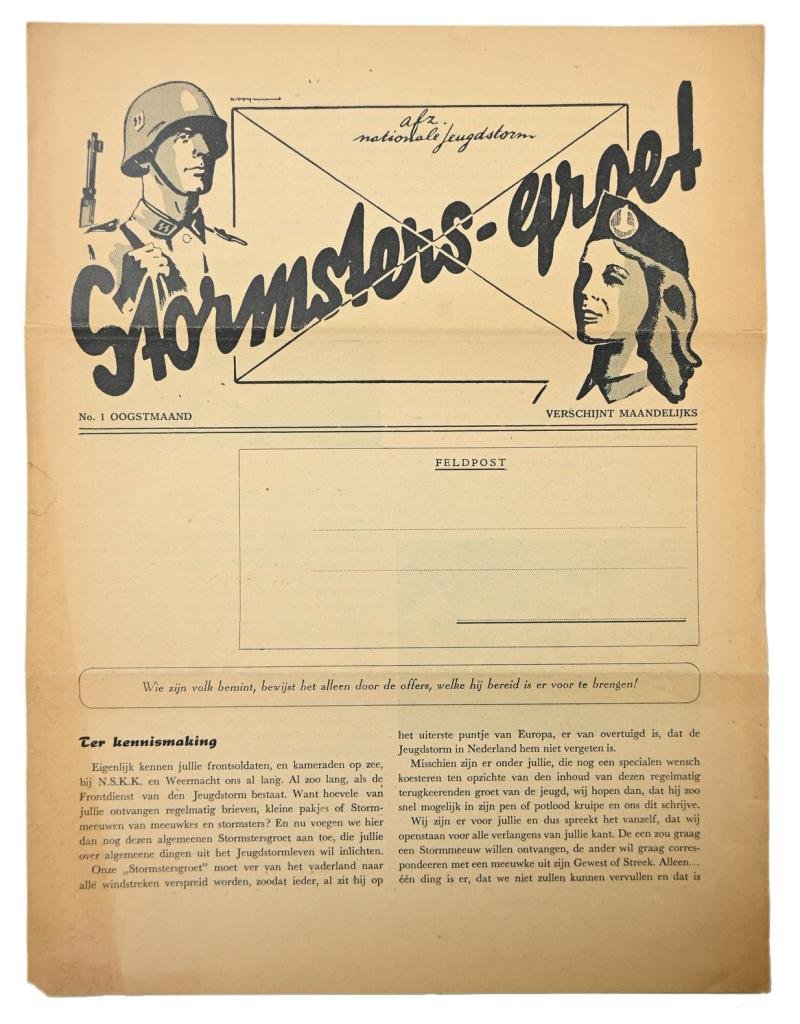 In a very good condition and extreme hard to find a Dutch Hitler Youth 'Nationale Jeugdstorm' Flyer 'Stormsters-Groet'. The flyer comes as the number 1 version. A very hard to find flyer!