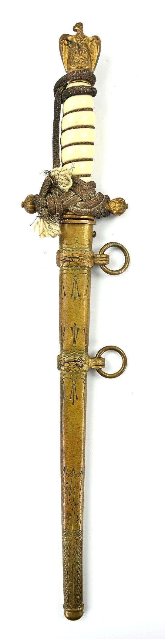 In a very good condition a German Kriegsmarine Officer's Dagger. The dagger comes with the original scabbard and is nicely maker marked by 'WKC' from Solingen. The dagger comes with only very light traces of use and has a clear blade with the etsing for 100% on both sides visible. Also very nice originally attached is the portopee cord. A very stunning example!!
