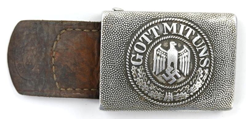 In a nice used condition a German Wehrmacht (Heer) beltbuckle with leater tab. The beltbuckle comes in Aluminium and is nicely maker marked on the tab and buckle by 'Paulmann Crone, from Lüdenscheid and dated 1938.
