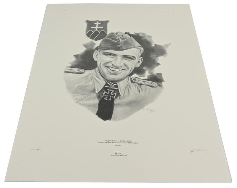 In a stunning mint condition a German Litho Limited Edition Print of Luftwaffe Flight Ace Oberst Hans-Ulrich Rudel, recipient of the Knight's Cross of the Iron Cross with Golden Oakleaves, Swords and Diamonds. The litho print comes in a size of 63,5 x 43,5cm and was made by the organisation of Knight's Cross Recipients 'Ordensgemeinschaft der Ritterkreuzträger e.V.' in 1989. The print has a limited edition of 500 pieces. This print has number 331. A very stunning print to frame for wall display! The most decorated German pilot of the war and the only recipient of the Knight's Cross with Golden Oak Leaves, Swords, and Diamonds, Rudel was credited with the destruction of 519 tanks, one battleship, one cruiser, 70 landing craft and 150 artillery emplacements. He claimed nine aerial victories and the destruction of more than 800 vehicles. He flew 2,530 ground-attack missions exclusively on the Eastern Front, usually flying the Junkers Ju 87 'Stuka' dive bomber.