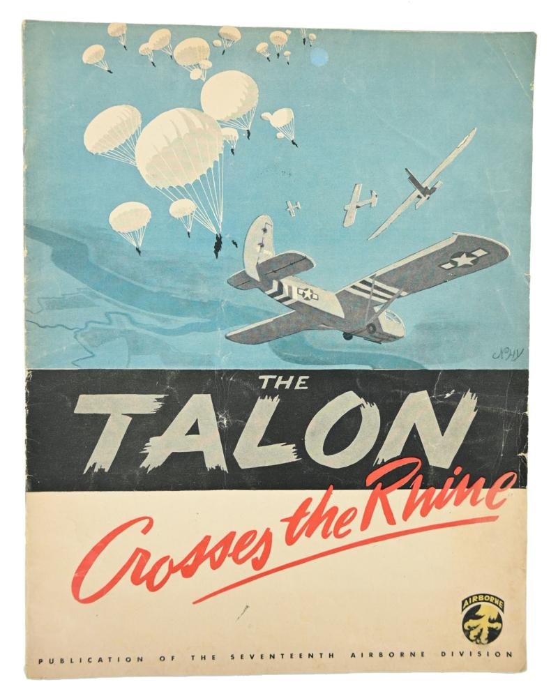In a good condition a very hard to find US WW2 17th Airborne Division Booklet entitled 'The TALON crosses the Rhine' was published by the Division just after war and relates the actions of the 17th Airborne Division during the last and bigger Allied Airborne of the WW2. The booklet was issued to the members of the division and is nowadays only seen in musea. The booklet comes with 20 pages and has a paperback cover and a size of 30x25cm. The booklet contains various stunning pictures, member pics, Award lists and the roll of honor. A very stunning rare Airborne booklet!