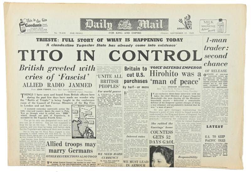 In a very good condition a British WW2 Newspaper 'The Daily Mail'. The newspaper is dated 21 September 1945 and has the header of Tito in Controle!