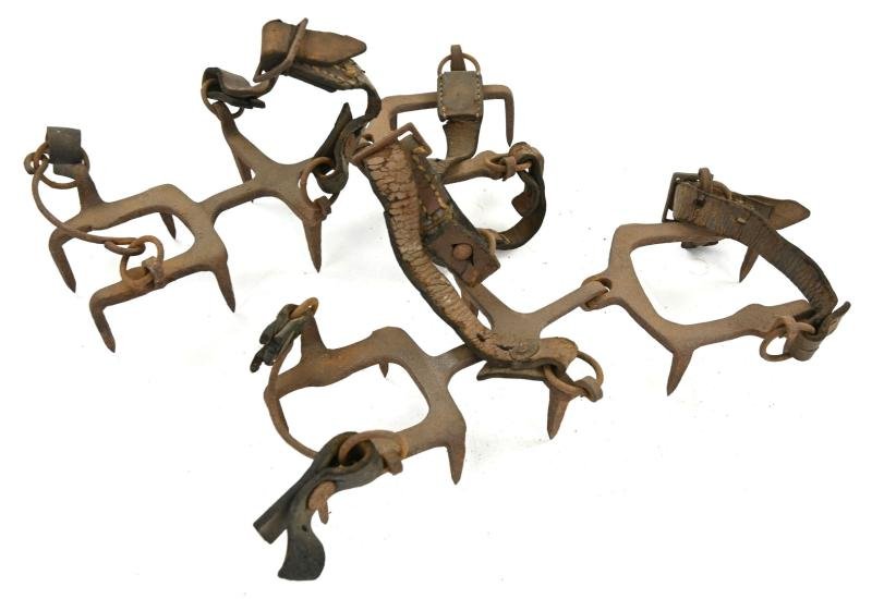 In a used condition a matching set of German Wehrmacht Mountain troops (Gebrigsjager) Ice Cleats. The cleats are both maker marked (hard to read) and dated 1941. The steel made cleats are complete with the original attached leather shoe straps in a dry condition. A very nice hard to find set!
