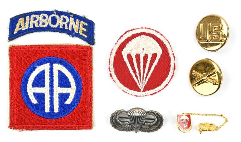 In a very good condtion a US WW2 82nd Airborne Division / 456th Parachute Field Artillery Battalion Grouping. The grouping contains the 82nd Airborne Division SSI, Parachite Artillery Garrison Cap badge, Sterling Silver marked Jumpwing, 456th GFAB Sweatheart chain crest and jumpwing and a set of Tunic Discs. A very stunning set for display!