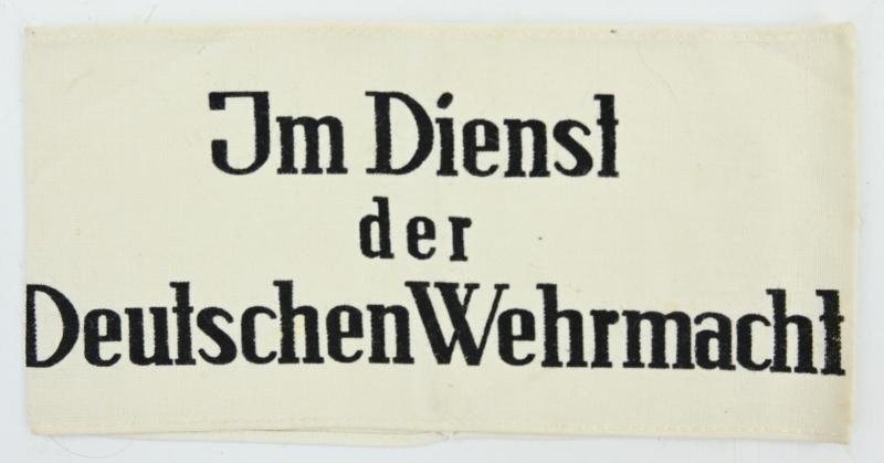 In a very good condition a German Wehrmacht 'Im Dienst der Deutschen Wehrmacht' Armband. As used by members of the RAD, NSKK etc. The white linnen base armband has a printed text on the front 'Im Dienst der Deutschen Wehrmacht'.