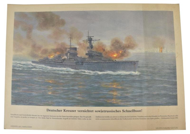 In a very good condition a large sizee German Kriegsmarine Poster. The poster is made by the Marine-Bilderdienst with help from the Oberkommando der Kriegsmarine and contains a painting of Adolf Bock from Berlin 'Deutscher Kreuzer vernichtet sowjetrussisches Schnellboot!' A very stunning poster for display!