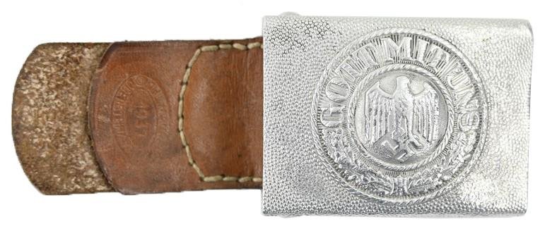 In a nice condition a German Wehrmacht (Heer) Beltbuckle with Leather Tab. The beltbuckle comes in aluminium and has the original mounted tab marked by Jul. Maurer, Oberstein/Nahe and is dated 1937.