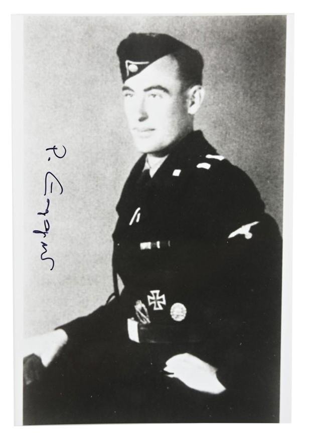 In a very good condition an original signature on a postwar picture of Paul Egger. SS-Obersturmführer Paul Egger earned the German Cross in Gold on December 30, 1944 and the Knight's Cross of the Iron Cross on April 28, 1945 with 1./ schwere SS-Panzer-Abteilung 502.