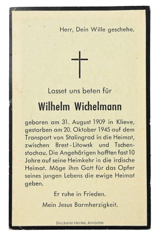 In a very good condition a German WW2 Deathcard on the name of 'Wilhelm Wichelmann'. Wilhelm past away in Russian captivity. A very nice deathcard.