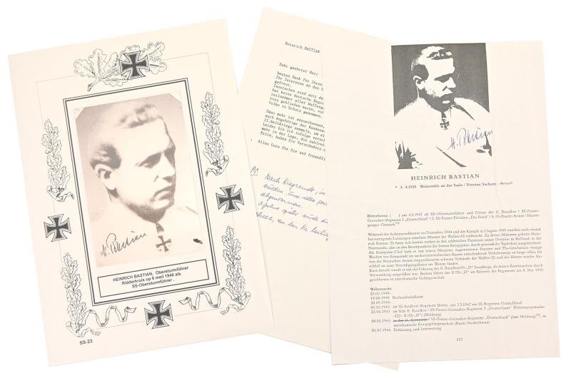 In a very good condition a postwar photo with original signature of Heinrich Bastian. SS-Obersturmführer Bastian earned the Knight's Cross of the Iron Cross on May 6,1945 as SS-Obersturmführer und Führer, II. Bataillon, SS-Panzergrenadier-Regiment 3 'Deutschland'. The picture with signature comes together with a personal letter and his wartime achievement record.