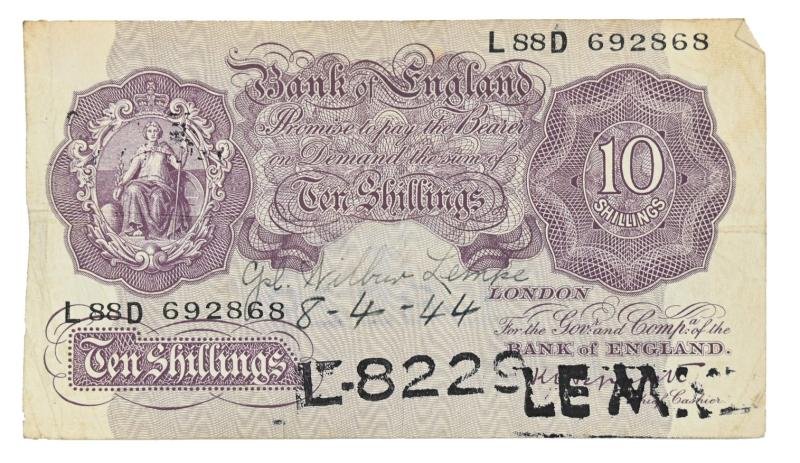 In a nice used condition a British WW2 Named Banknote. The banknote was taken and marked as souvenir by US Corporal Wilbur Lemke, member of the 131st Anti-Aircraft Artillery Battalion.