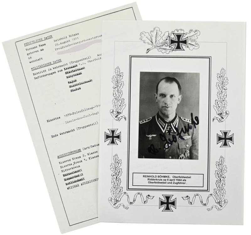 In a very good condition a postwar picture with original signature of Reinhold Böhmke. Oberfeldwebel Reinhold Böhmke earned the Knight's Cross of the Iron Cross on April 6, 1944 as Oberfeldwebel und Zugführer in the 13. Kompanie/ Grenadier-Regiment 162 of the 61. Infanterie-Division. The picture with signature comes together with the original war achievement record of Reinhold.