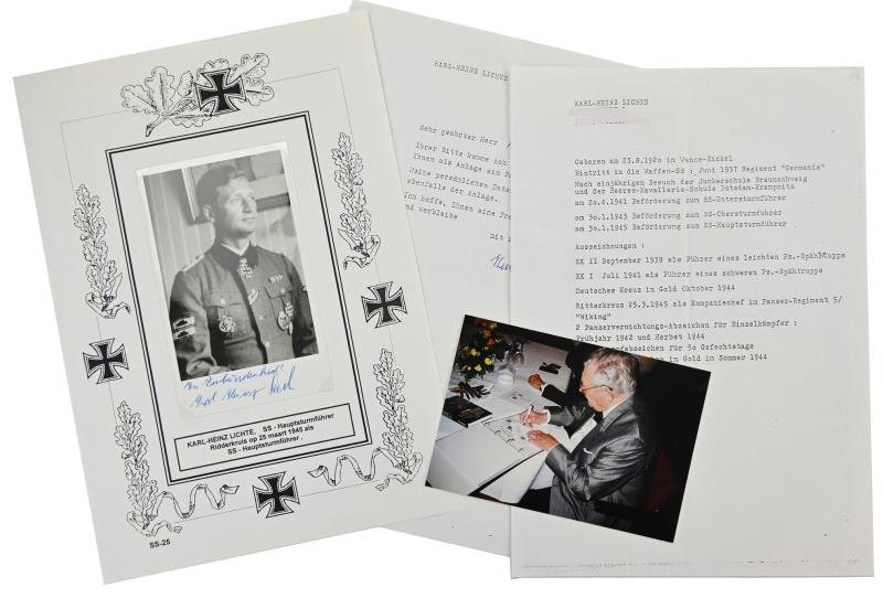 In a very good condition a postwar picture with original signature of Karl-Heinz Lichte. Karl-Heinz earned the German Cross in Gold and Knight's Cross of the Iron Cross as Chef of 5./ SS-Panzer-Regiment 5 “Wiking”. Knight's Cross was awarded for his actions during the relief efforts toward Budapest in January 1945. The picture with signature comes together with his wartime achievement record and a picture of Kar-Heinz signing the attached document with is signature.