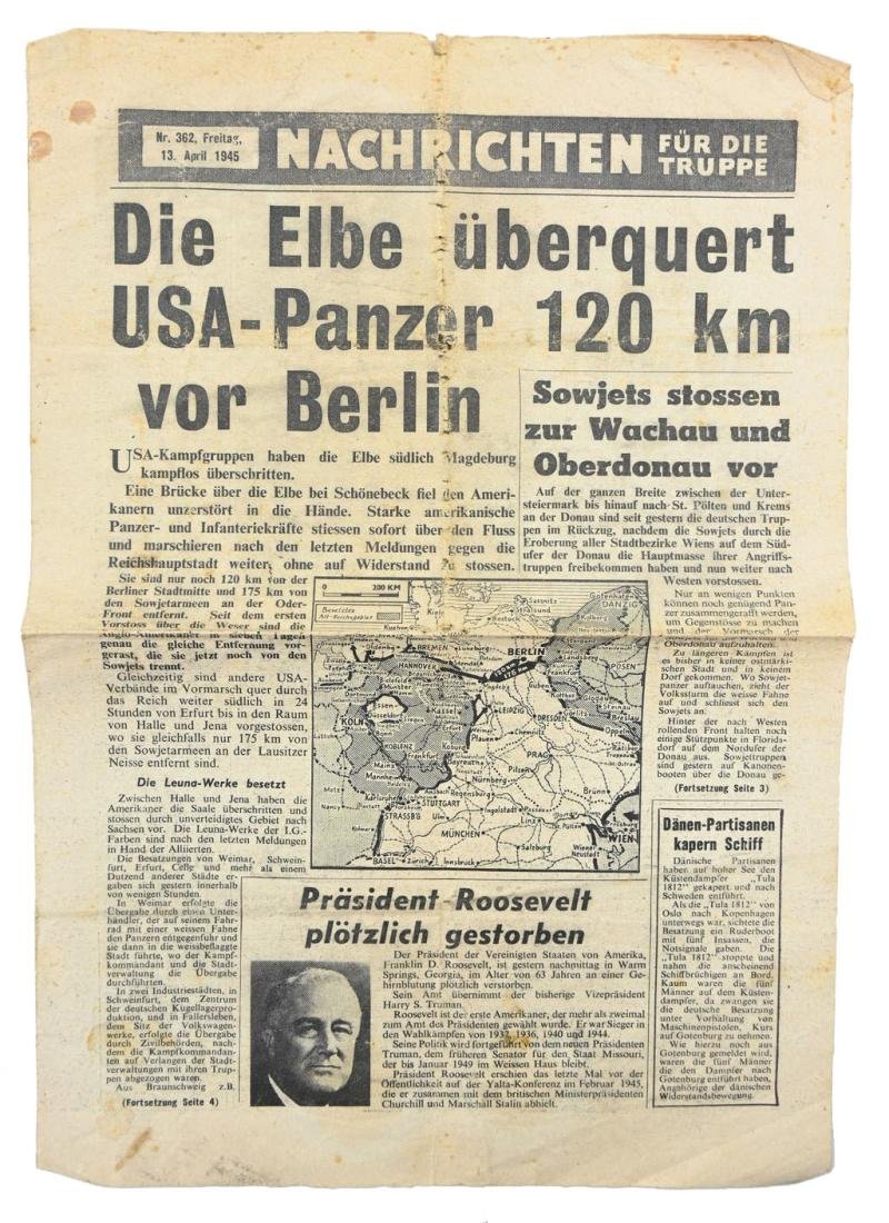 In a nice condition an Allied WW2 Droppingsflyer 'Nachrichten für die Truppe' 13 April 1945. These 'Nachrichten für die Truppe' flyer/newspaper were dropped by the US Air Force above Germany between April 1944 and May 1945.