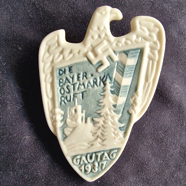 'Die Bayer. Ostmark Ruft Gautag 1937' Porcelain Tinnie (Porzellanabzeichen). With glued on pin-back system. Decorative original tinnie.