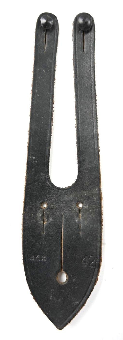 In a very good condition a German Wehrmacht Binocular Button Attachment Leather. The black leather is light used and is nicely maker marked by 'ddx' and is dated 1942. The leather was used to attach the binocular to the tunic so that the binocular hold his place in combat situation. A very nice and stunning attachment leather complete with the two original studs.