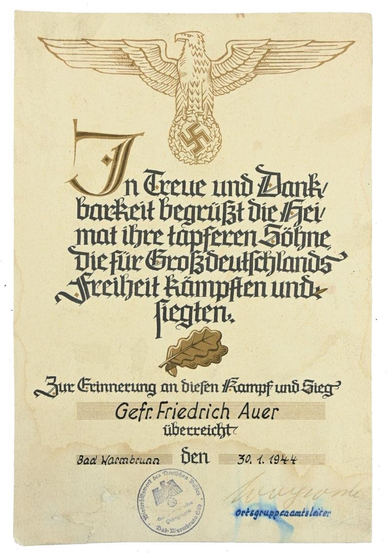 In a very good condition a German Wehrmacht (WHW made) Death Certificate on the name of Gefreiter Friedrich Auer. Friedrich past away on 30 January 1944.
