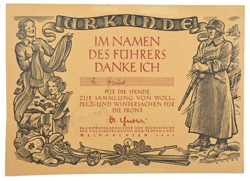 In a very nice condition a German Third Reich War Effort Certificate. The certificate was issued to civil people that gave warm cloth for the soldiers.