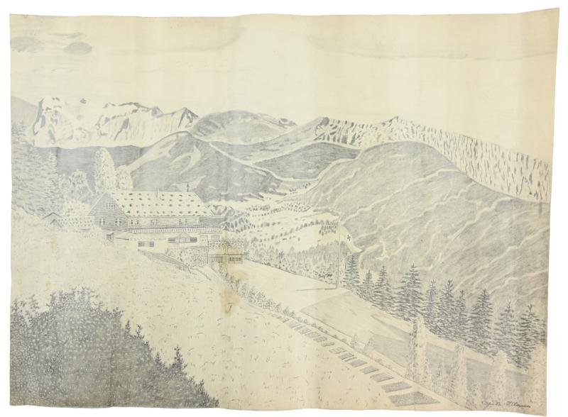 In a very good condition a stunning drawing of the Adolf Hitler residence in Bergtesgaden, Haus Wachenfeld. The drawing comes in a large size of 53x73cm and is nicely signed by the maker. A very stunning wartime period drawing.
