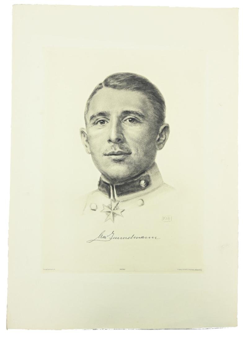 In a very good condition and rare to find a Print of the charcoal drawing made by K.J. Böhringer of Max Immelmann. The print comes in a size of 37x53cm and is uncut. The paper contains the pressing for a framework. Max Immelmann (21 September 1890 â 18 June 1916) PLM was the first German World War I flying ace.He was a pioneer in fighter aviation and is often mistakenly credited with the first aerial victory using a synchronized gun, which was in fact achieved on 1 July 1915 by the German ace Kurt Wintgens. He was the first aviator to receive the Pour le MĂ©rite (colloquially known as the 'Blue Max' in his honour), being awarded it at the same time as Oswald Boelcke. His name has become attached to a common flying tactic, the Immelmann turn, and remains a byword in aviation. He is credited with 15 aerial victories. This rare litho comes directly from the famous publishing house 'Franz Hanfstaengl' from Munich were it was discovered last year. Franz Hanfstaengl was one of the intimate followers of Adolf Hitler. Hanfstaengl and Hitler remained close through the 1920s and early 1930s. He considered Hitler a diamond in the rough, lacking refinement and social skills. He took it upon himself to do the polishing. Introducing Hitler to Munich's high society, he helped finance the publication of Mein Kampf and, dollar rich in inflation-hit Germany, bankrolled the NSDAP's newspaper Völkischer Beobachter.