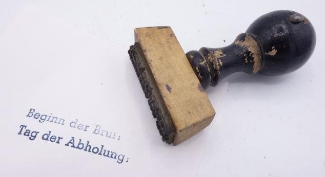 In a very nice condition a German Wehrmacht Ink-Stamp. The ink-stamp is a WW2 original stamp and not a copy like you see mostly. The stamp has the text: Beginn der Bruf: Tag der Abholung: Very hard to find stamp!