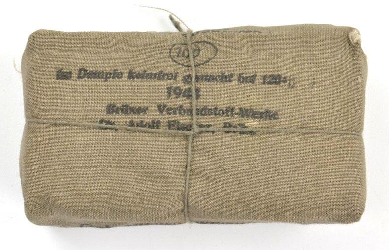 In a stunning mint condition a package of German WW2 First Aid Bandage. The canvas made package is nicely dated 1944 and maker marked by Bruxer Verbandstoff-Werke. These packages were used in the soldiers tunics in the small inner pocket. Each tunic contains one small and one large first aid package. This example is the large version. The price is for one package of first aid bandage. Article shall be on sold when the last one is sold.
