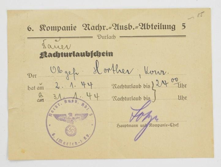 In a very good condition a German Wehrmacht (Heer) Night Leave Certificate (Nachurlaubschein) for a Obergefreiter in the 6.Kompanie Nachrichten Ausbuildungs Abteilung 5. The certificate is dated 1944.