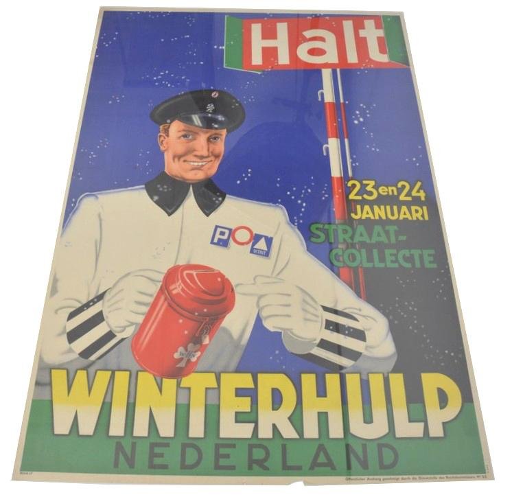 In a very nice condition a German /Dutch Winterhulp (WHN) Poster. The poster comes in a size of 83x119cm and has on the lower corner the K-number K288, indicating printing in Holland. The poster is also marked ''Offentlicher Aushang genemigt durch die Dienststelle des Reichskommissars', plakat nr.53. A very nice poster!