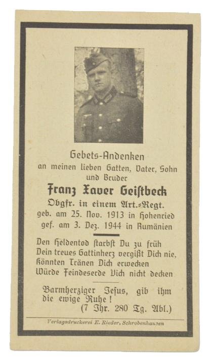 German WH Deathcard 'Franz Xaver Geistbeck'
