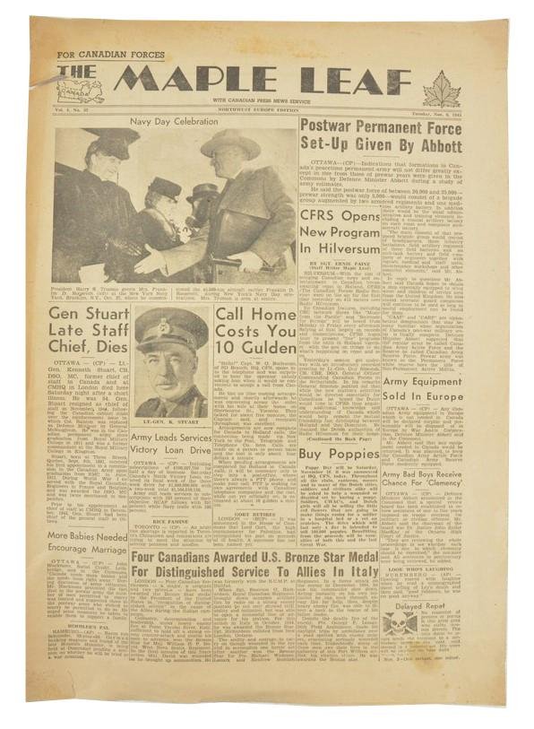 In a very good condition a Canadian Maple Leaf Newspaper. The newspaper is dated 6 November 1945.