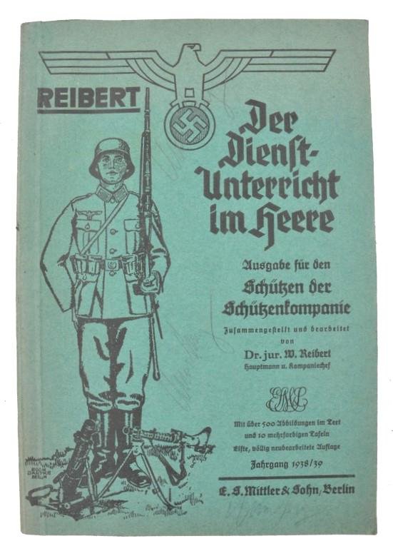 In a very good condition a German WH Handbook - 'Reibert' - 'Der Dienst-Unterricht im Heere'. Special edition for 'Schützen der Schützenkompanie'. The book was published in 1938/39 by the 'Verlag von E.S. Mittler & Sohn' in Berlin. Nice example in good used condition!