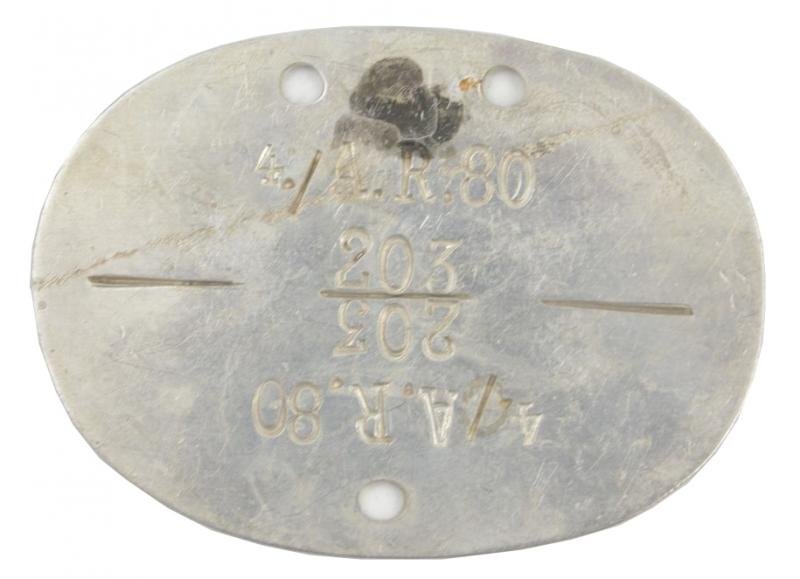 In a very good condition a German Wehrmacht dog-tag. The Aluminium made dogtag is marked '4./A.R.80' indicating use by a member of the 4.Kompanie Artillerie Regiment 80 that was issued to the 8.Panzer-Division.