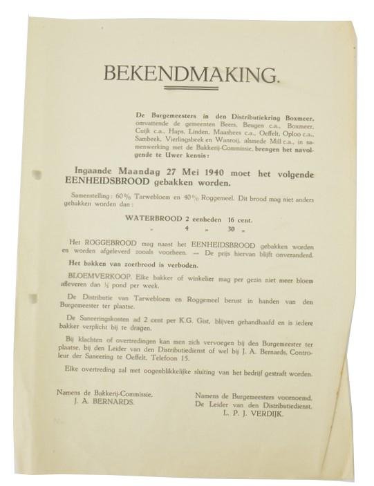 In a very nice condition a Dutch Announcement Leaflet of the region Boxmeer Holland from 27 May 1940. The announcement contains the content of the bread that must be baked.