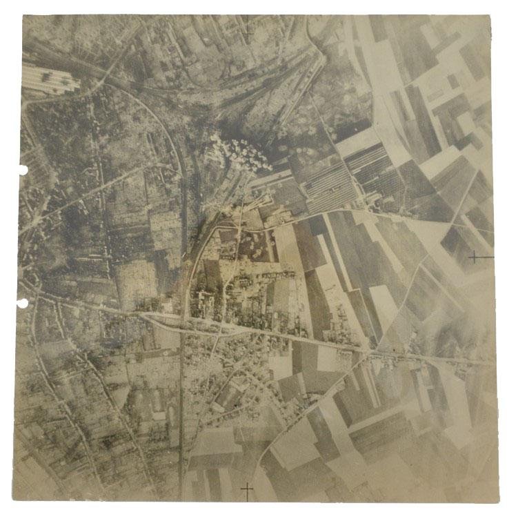 In a very good condition an British WW2 Aerial Bombing Picture of the large trainstation in Douai France on 22 May 1944. The picture is taken from the bomber planes! The picture comes in a size of approx 25x25cm and is Air Ministry marked on the paper. Very nice for display!