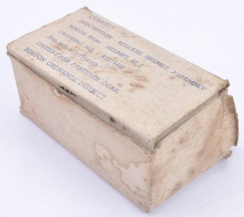 In a never used condition a full box of US WW2 Box of M1 Helmet Quick Release Fasteners. The box contains 25 pieces and were made by United Carr Fastener Corp. Inside the box is also the original paper that is dated July 1944.