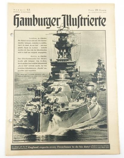 In a nice condition a German Magazine 'Hamburger Illustrierte' published on 23 Oktober 1939 as number 43 with a large picture of the British 'Royal Oak' Battleship! A very nice cover!