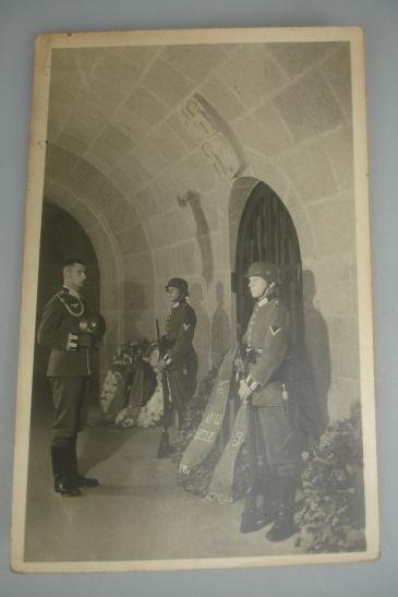 In a nice condition a German Picture of a Adolf Hitler memorial wreath at a tomb. The tomb is guarded by Wehrmacht troops in parade tunics. Very nice picture!