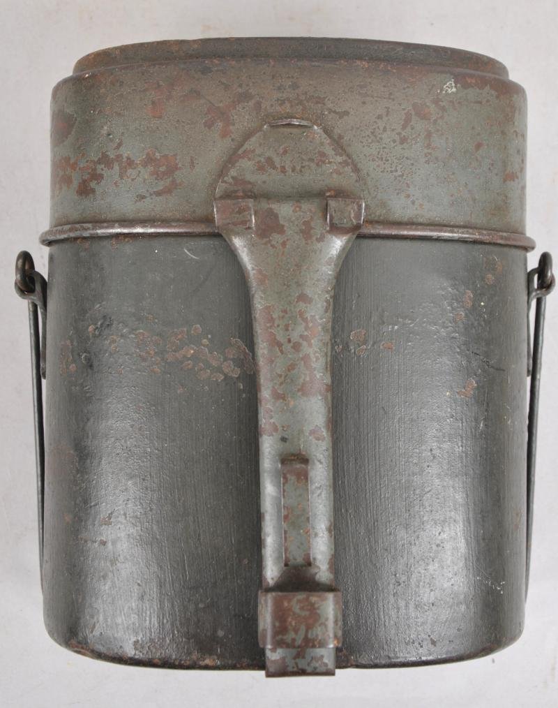 A late WW1 model of German messtin this being one of the 'Ersatz' models in tin with green finish. The tin or zinc coated messtins were produced up until the end of the war by some manufacturers who were still holding large stocks. Greatly replaced by the green enamel versions this would have been one of the last productions of its type. This messtin is B initialled to the lid with the date '18' visible. Faint maker marking to body with fitting to lip for carriage of the fork & spoon set. There is a good amount of its green paint still remaining. A scarce item to find.