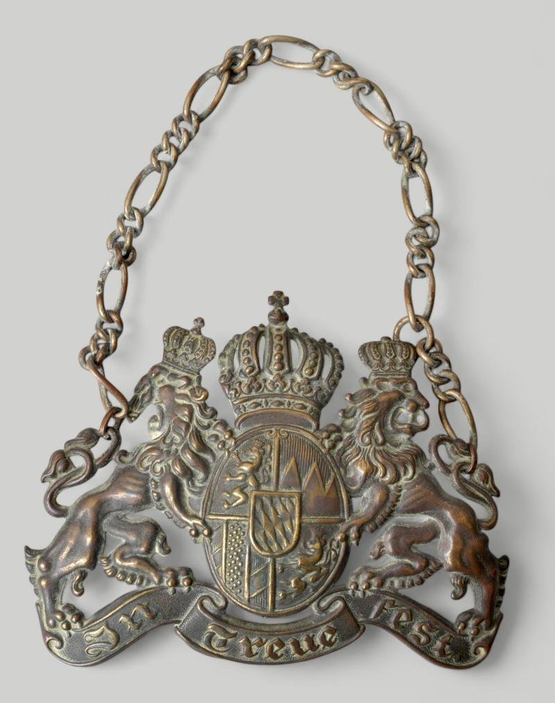 A brass Bavarian pickelhaube plate with both lugs removed from rear & a chain added to hang from the wall. No doubt adorned somebodys wall or mantelpiece for may years after WW1.